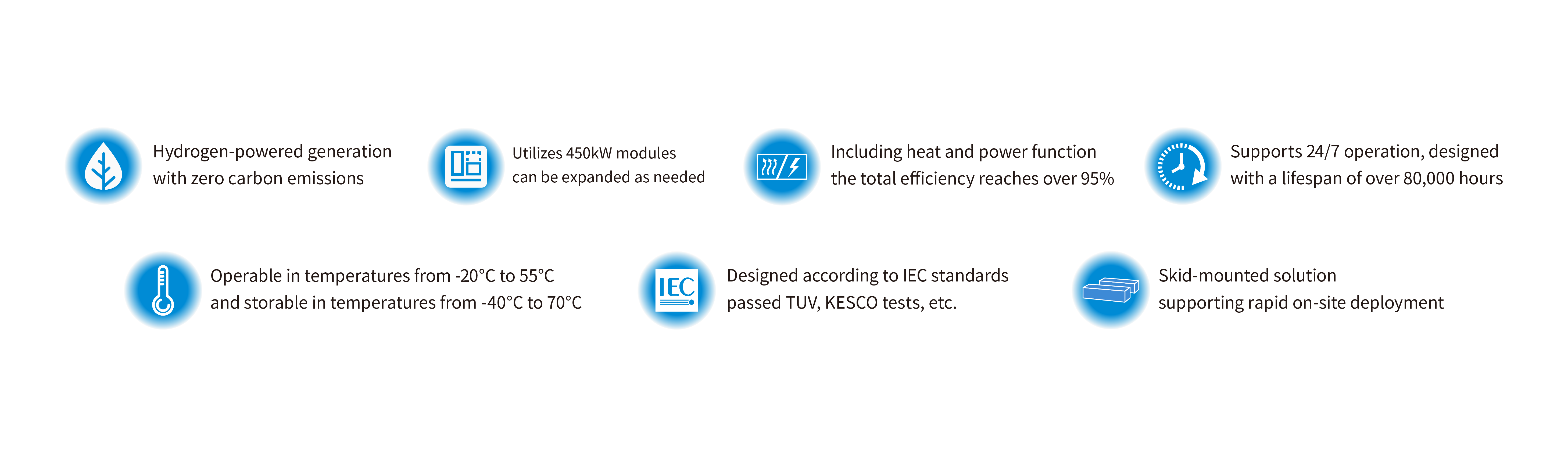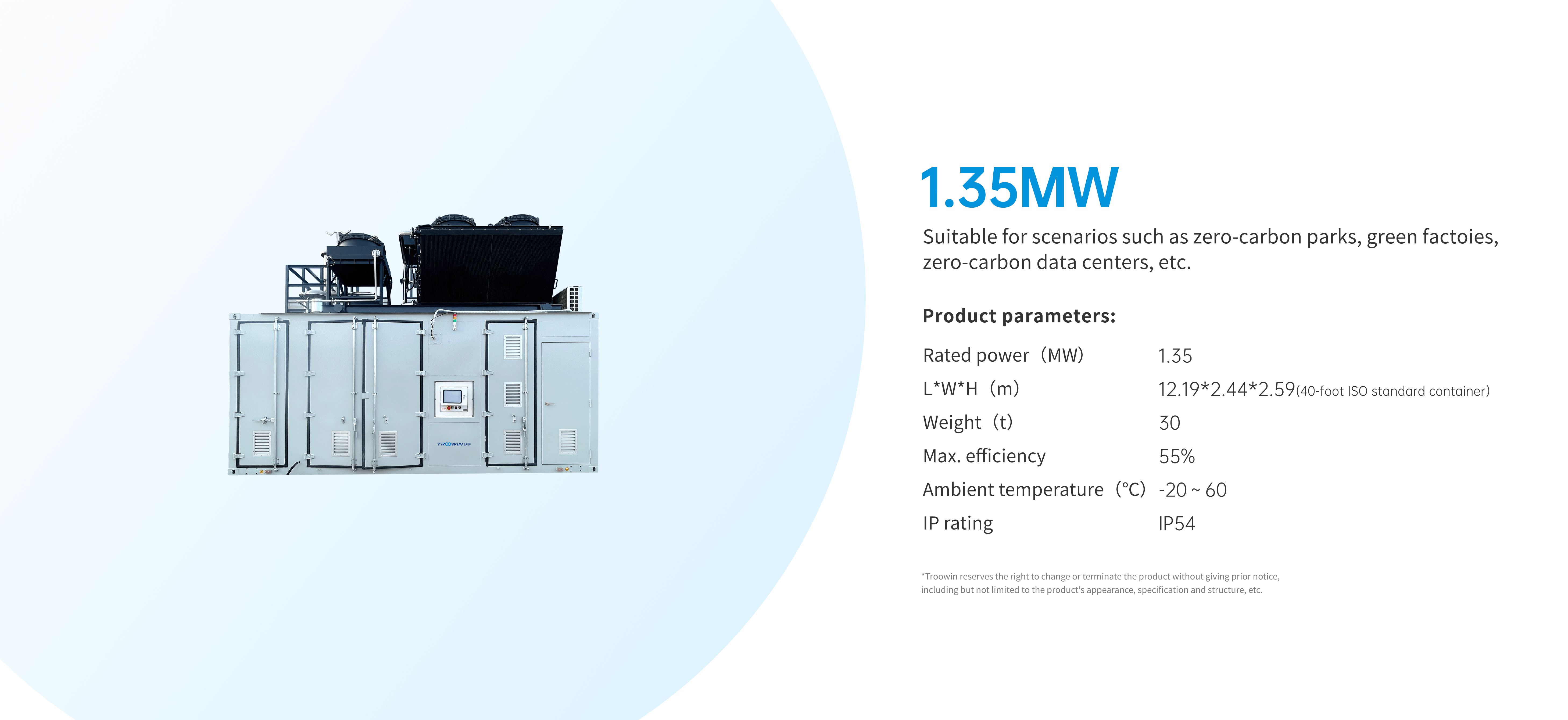 Troowin 1.35MW fuel cell power plant is developed based on the self-researched G4 platform, specifically designed for primary power generation scenarios, and can be used in parallel according to customer requirements. The system has passed over 46 tests, including product performance, safety, IP protection and EMC. The system is suitable for scenarios such as zero-carbon parks, green factories, zero-carbon data centers, etc.