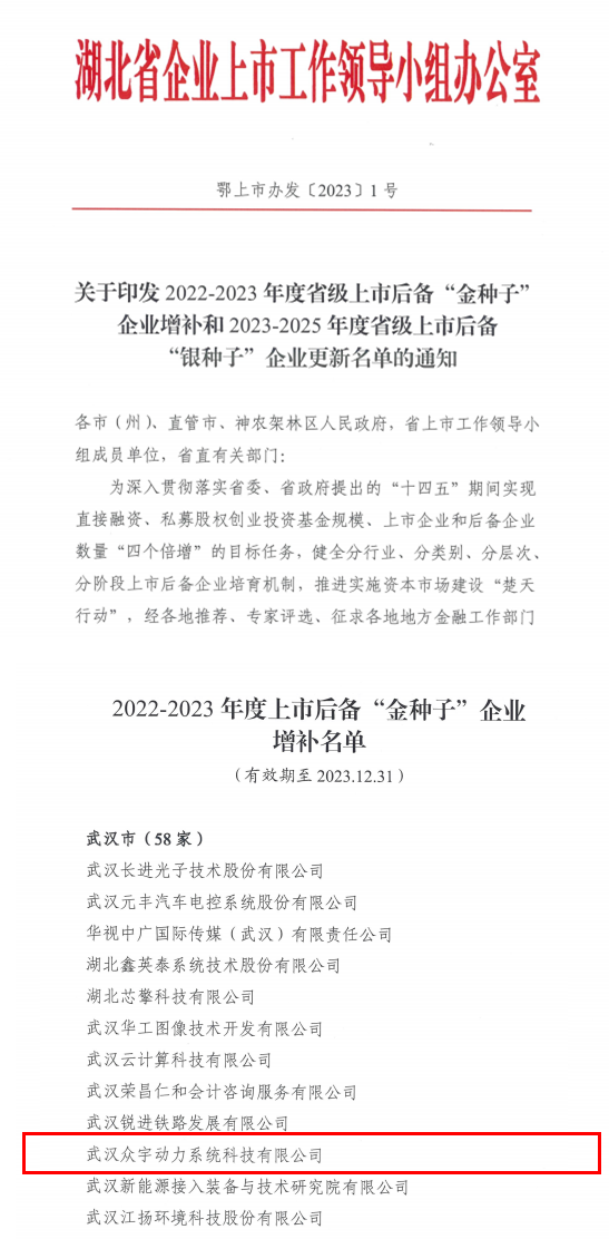日前,湖北省企業(yè)上市工作領(lǐng)導(dǎo)小組辦公室公布了2022-2023年度湖北省上市后備“金種子”企業(yè)名單,武漢眾宇經(jīng)過推薦與評選,成功入選名單。