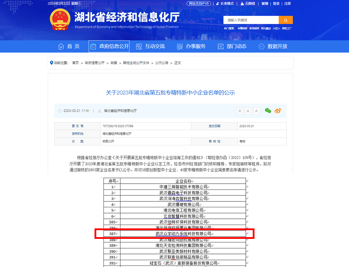 3月21日,湖北省經(jīng)濟和信息化廳公布2023年度 “專精特新”中小企業(yè)名單,眾宇成功入選,獲認(rèn)定 “專精特新”企業(yè)榮譽稱號。
