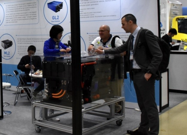 電堆是發生電化學反應的場所,也是燃料電池動力系統核心部分,GL2&ML2電堆模塊可擴展的功率輸出分別為10~40kW和10~50kW,同時集成了單電池電壓信號采集功能,該兩款自主研發的電堆作為眾宇動力燃料電池水冷動力系統產品的核心技術組件,現場吸引了眾多國內外眾多參觀者的目光。