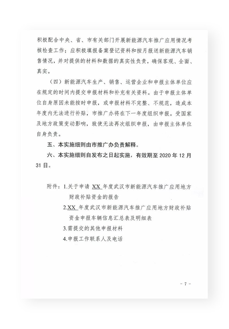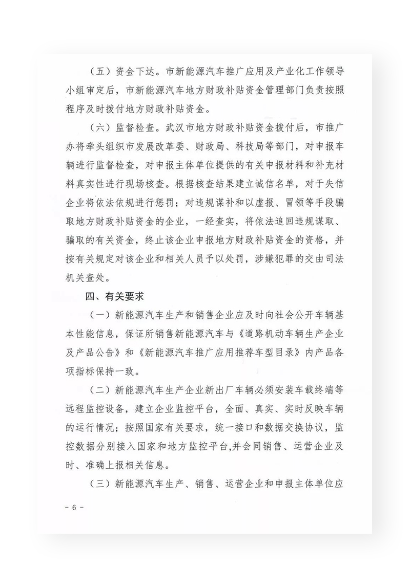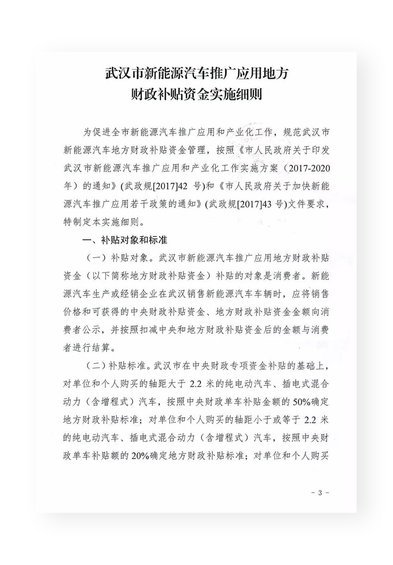 補貼標準:武漢市在中央財政專項資金補貼的基礎上, 對單位和個人購買的軸距大于2.2米的純電動汽車、插電式混合動力(含增程式)汽車,按照中央財政單車補貼金額的50%確定地方財政補貼標準;對單位和個人購買的軸距小于或等于2.2米的純電動汽車、插電式混合動力(含增程式)汽車,按照中央財政單車補貼額的20%確定地方財政補貼標準;對單位和個人購買的燃料電池汽車,按照中央財政單車補貼額1: 1的比例確定地方財政補貼標準。