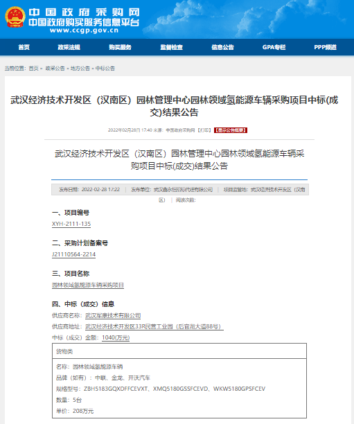 2022年2月28日,武漢經(jīng)開區(qū)發(fā)布?xì)淠茉磮@林車項目中標(biāo)公告,開沃、金龍等品牌車型中標(biāo),眾宇將為其提供氫燃料電池系統(tǒng)。